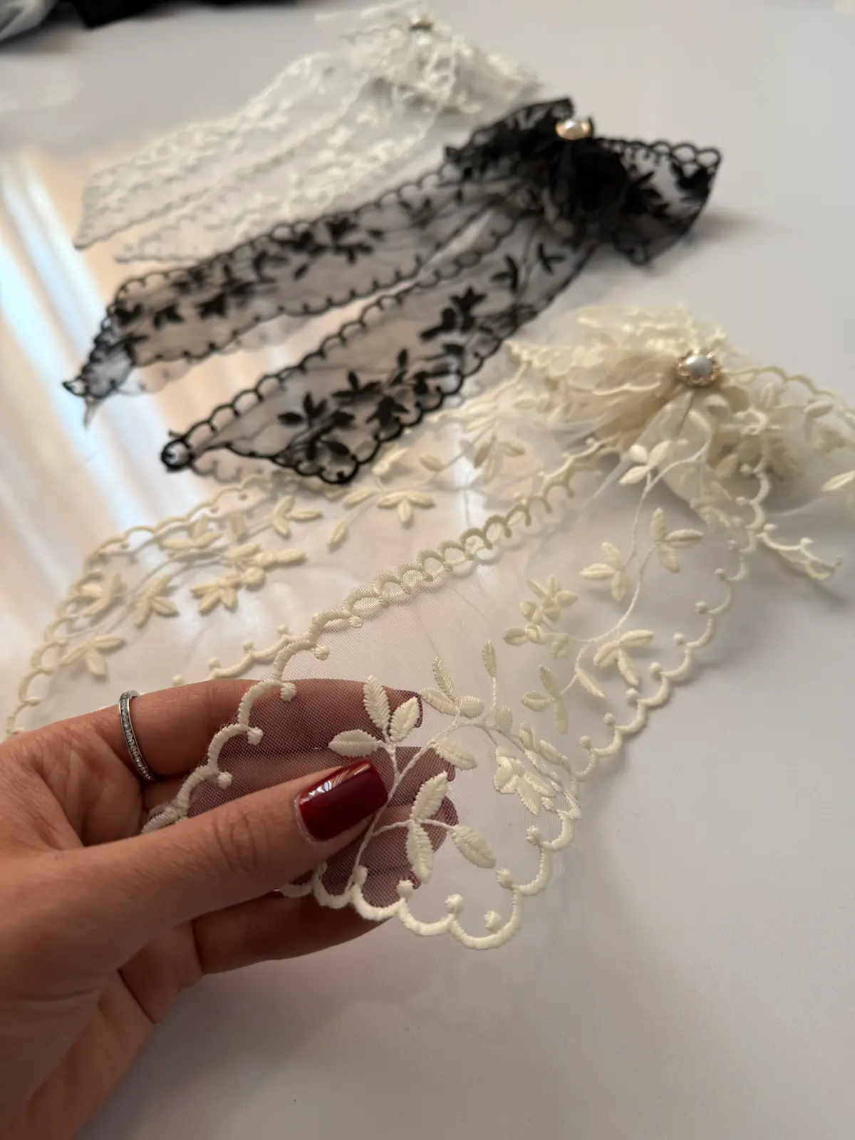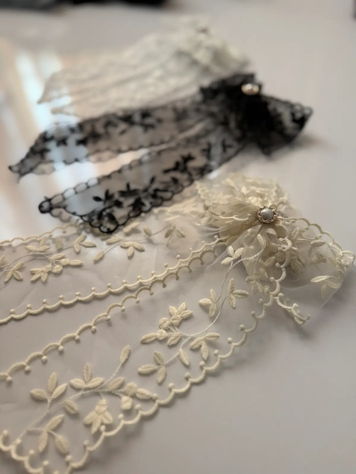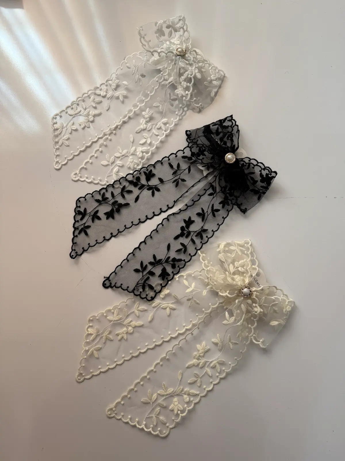 دستگاه رنگی پاپیونهای دانتل انتخابهای متنوعی را ارائه میدهد. رنگهای ملایم و طبیعی مانند کرم، پاستلی و مشکی از جمله محبوبترین رنگها هستند که به راحتی با انواع لباسها هماهنگ میشوند.